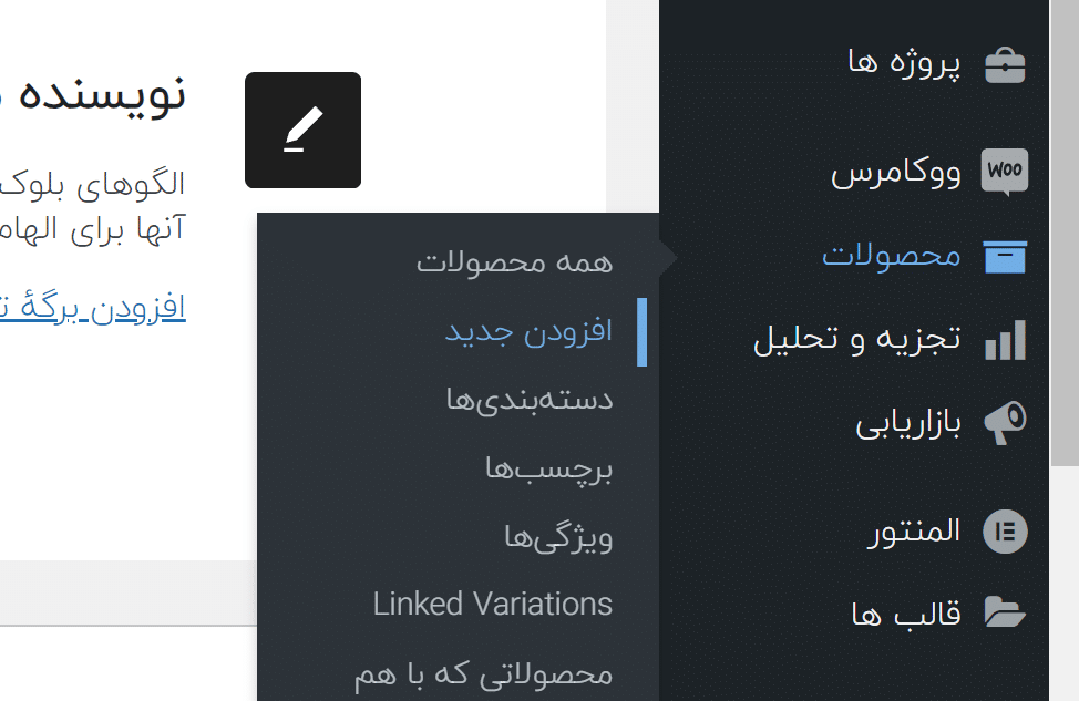 برای این کار بعد از ورود به پیشخوان وردپرس برروی تب محصولات کلیک کرده و افزودن محصول جدید را انتخاب کنید.