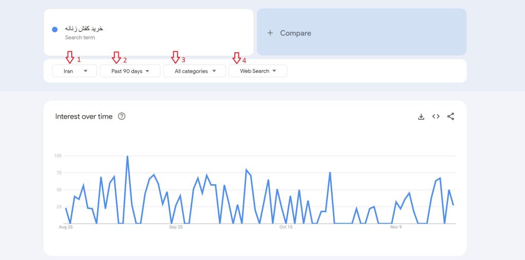 در بخش ۱ می توانید کشوری که قصد بررسی کلمهی کلیدی در آن را دارید وارد کنید. در قسمت ۲، بازهی زمانی را مشخص کنید. در بخش سوم دستهبندی و حوزهي مورد نظر انتخاب میشود. نهایتا در بخش چهارم میتوانید انتخاب کنید که این کلمه در سرچ وب یا یوتیوب و… بررسی شود. برای مثال ما میزان سرچ کلمهی خرید کفش زنانه را در ۹۰ روز گذشته بررسی کردهایم.
